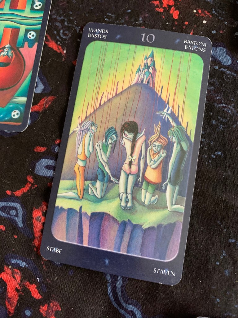 A therapist would no doubt diagnose these characters in the ten of wands with burnout. Burnout is the loss of meaning in one’s work, coupled with mental, emotional, or physical exhaustion as the result of long-term, unresolved stress. Of course burnout does not only come from work related situation. I drew this card as a part of the Tree of Life Shadow Work spread I decided to complete using this deck. The question connected to this card asked me about aspects of my childhood that were worth considering.