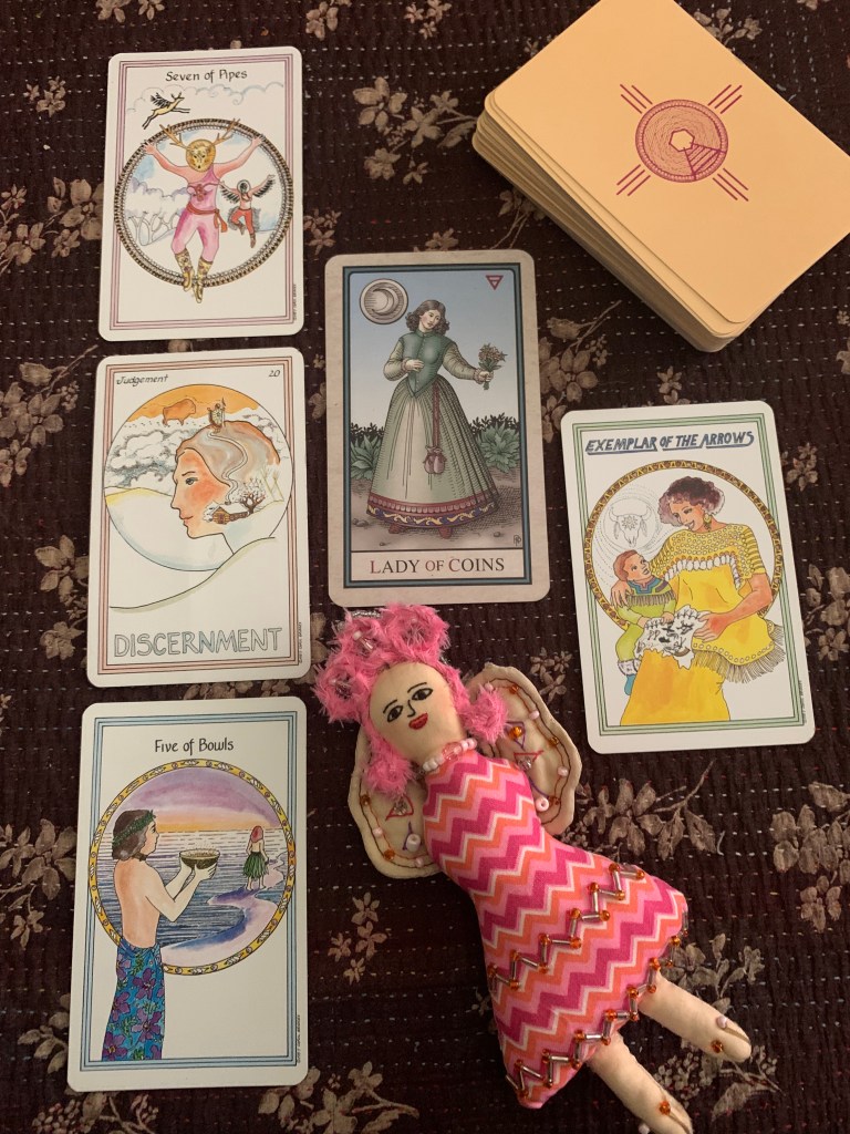 In Robert Place’s Alchemical Tarot it is the Lady of Coins who is the equivalent of the Page. I have been participating in a challenge working with the Inner child using the Medicine Woman Tarot by Carol Bridges and this Lady emerged as the first Page to work with. I placed the Lady of Coins in the centre and then used the Medicine Woman Deck.