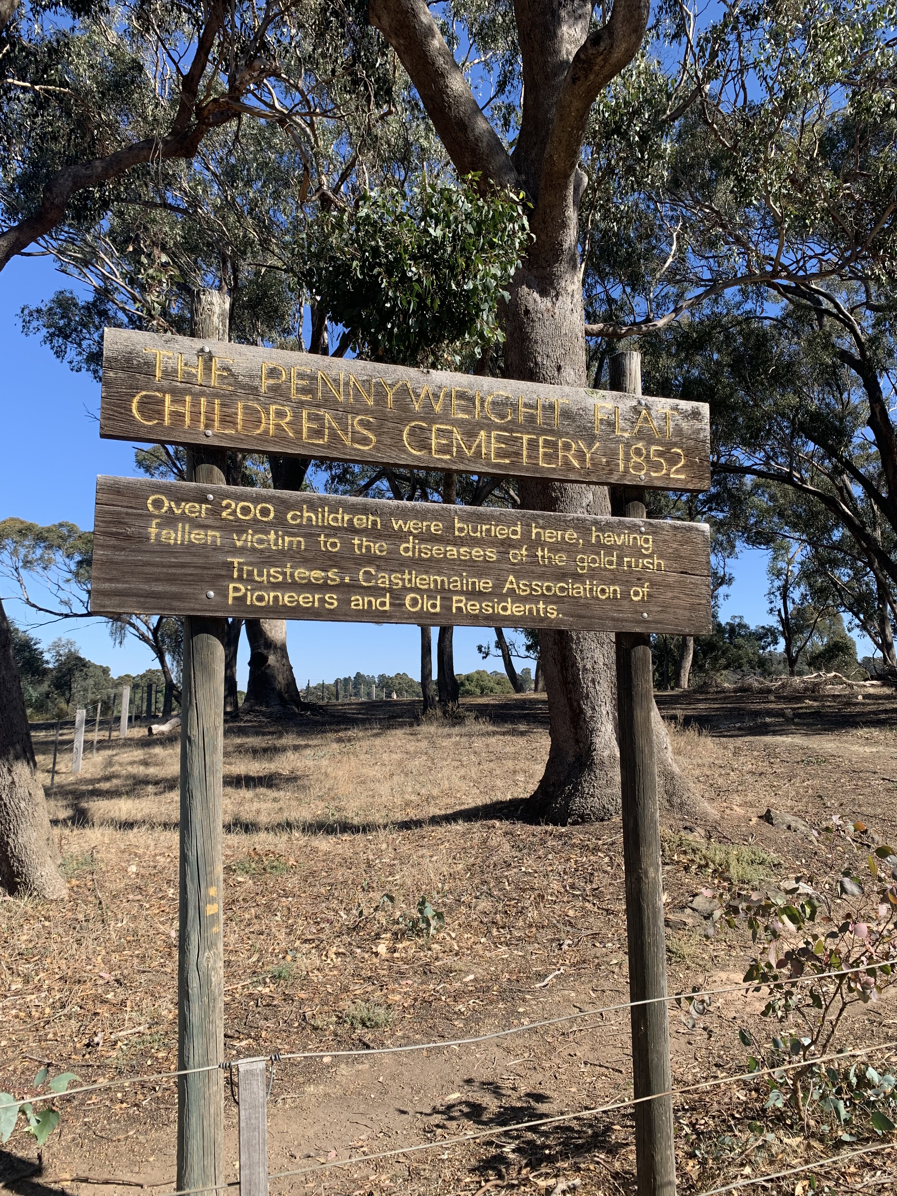 In 1852, on a barren piece of land that was of no use to gold miners or fossickers, a cemetery for the deceased children of the Castlemaine goldfields was set aside. Located within the Castlemaine Diggings National Heritage Park is Pennyweight Flat Children’s Cemetery. A pennyweight is a very small measure of gold.