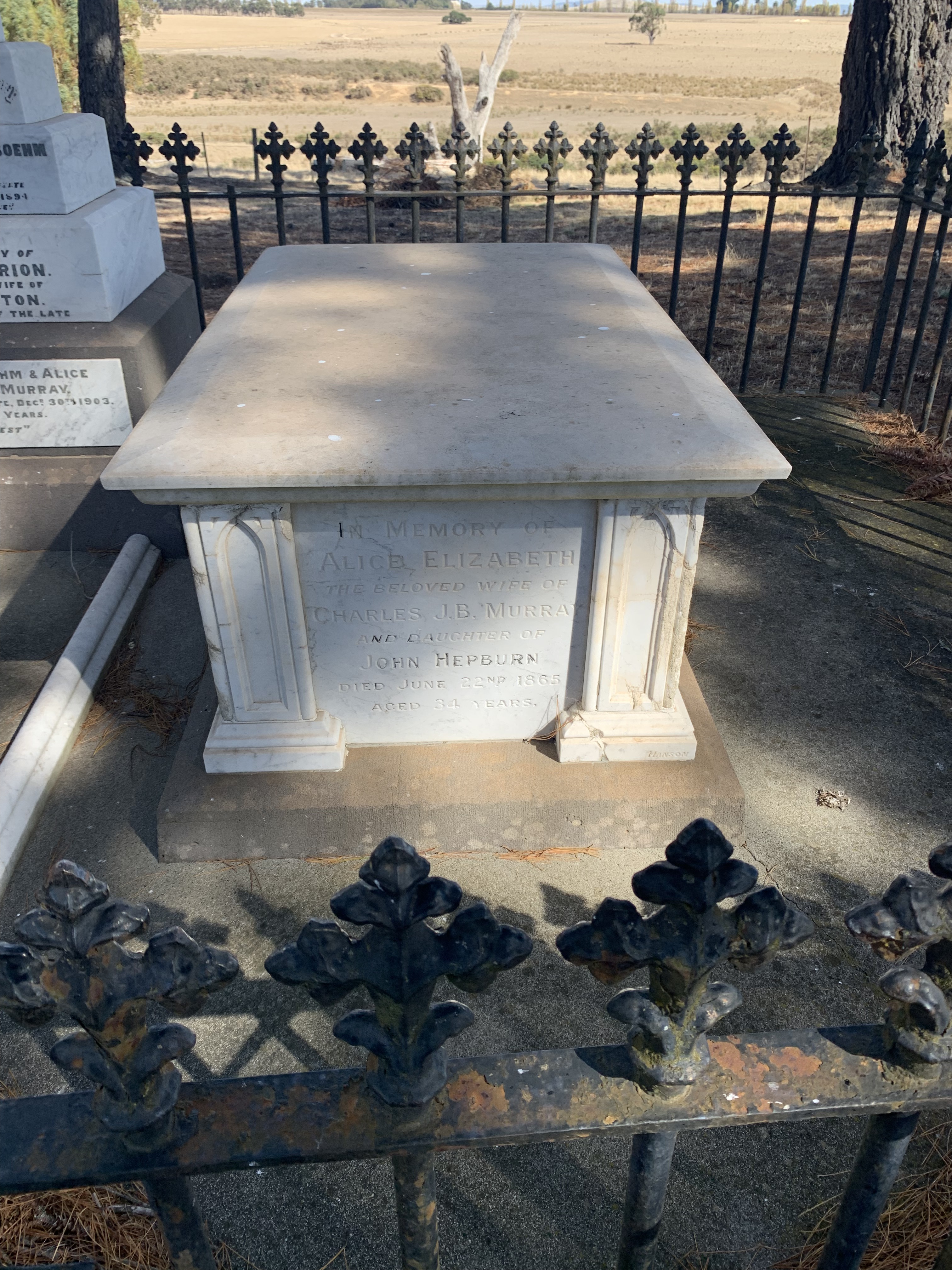 Hepburn Graves is the private family cemetery established by pastoralist, Captain William Hepburn near his homestead, ‘Smeaton House’. Hepburn (died 1860), his wife, family and relatives are buried in the cemetery withone retainer. The cemetery is fenced and plantings enhance the graves. Hepburn Graves are important as an intact private cemetery, representative of a number of such cemeteries associated with Pastoral Holdings. The graves have historical associations with the Hepburn family and are an excellent example of the arrangement, elements and plantings of a small nineteenth century cemetery. Captain Hepburn’s grave is a notable example of a tombstone of the period. Classified: 21/05/1964. File Note: See B1114, Smeaton House