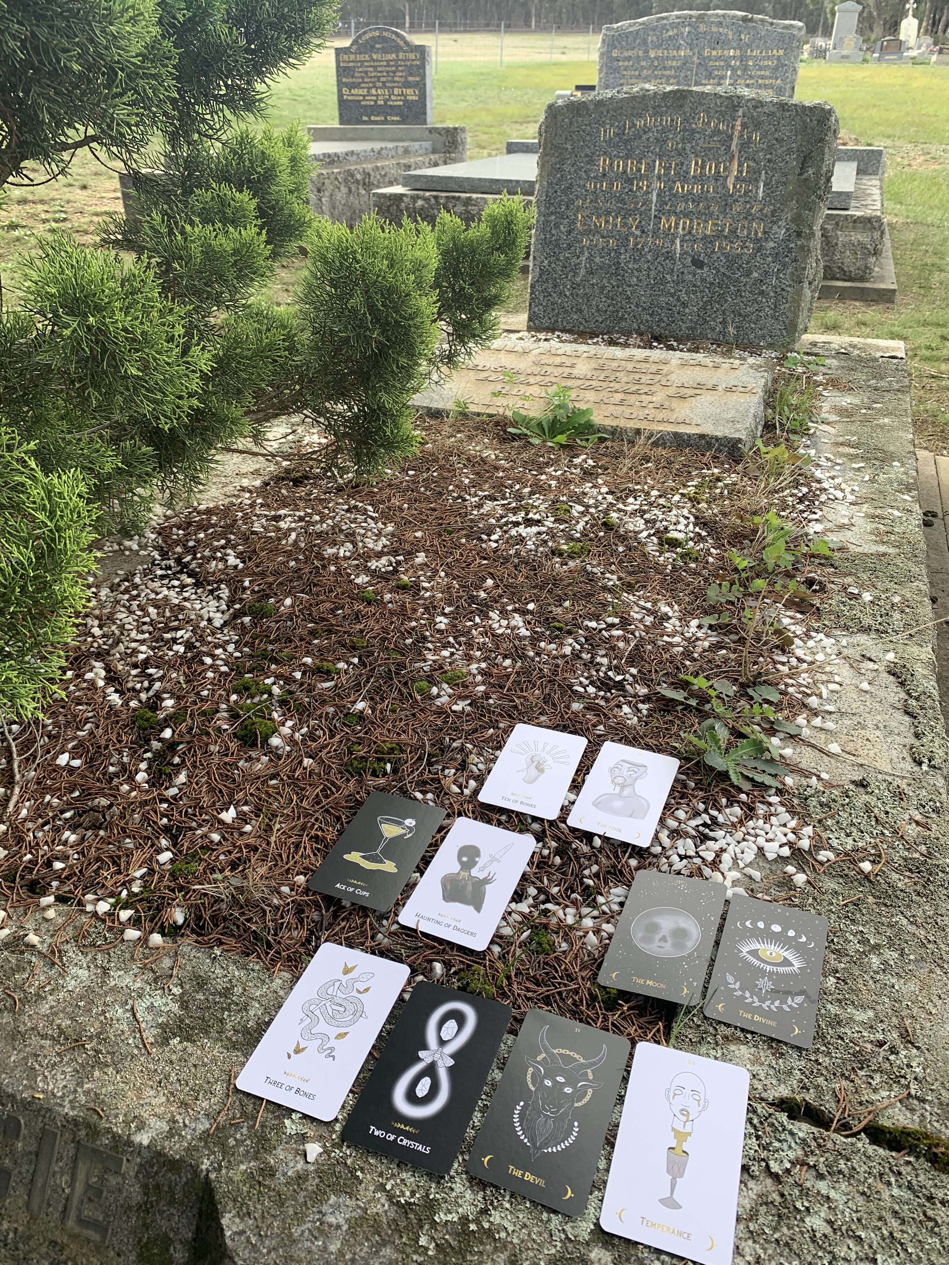 Take the time to pick up the energy of the Cemetery you choose to visit. Find the grave that calls to you. Shuffle and lay out some cards and then spend quiet reflective time journaling.