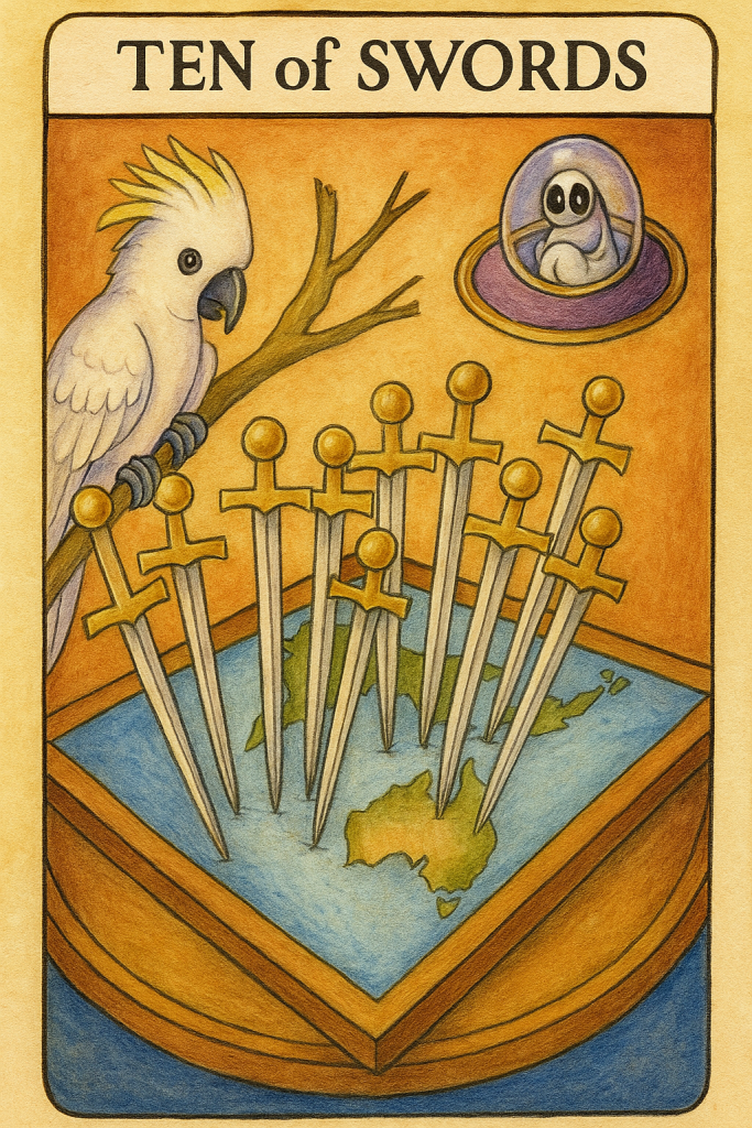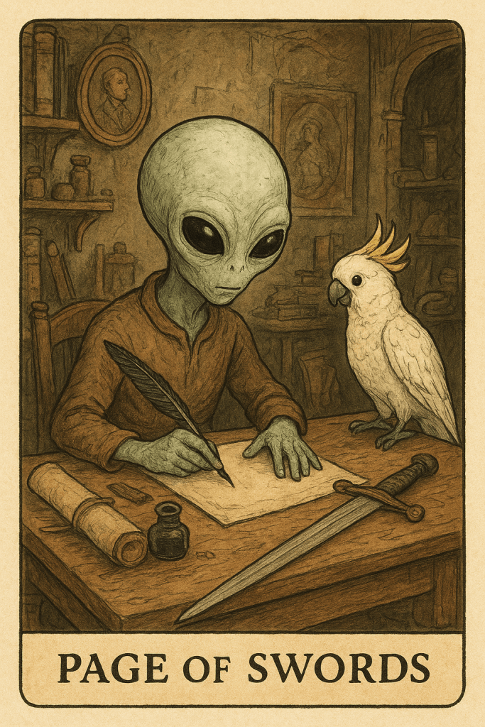 You begin with the Page of Swords—ink-stained fingers, sword resting on the table, quill hovering over parchment. He is restless, curious, alert to every whisper of thought. His sword is not yet heavy with battle but sharp with questions. He is the seeker who knows that language itself is a weapon, a spell, and a mirror. The Page is not alone—Bonnie, the cockatoo, perches close by. Sharp-eyed and sharp-tongued, she squawks, laughs, and whispers truths he might otherwise miss.