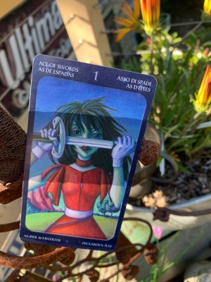 In traditional representations of the Ace of Swords, whoever holds the sword is invisible. What we see is a hand emerging from the clouds wielding a double edged sword. Seemingly floating on air currents, the sword is available for whoever wants to grasp it. In general, while most swords in tarot are held at an angle, to suggest logic tempered by flexibility or emotion, the Ace is held straight up and down. Not here. This sword is being held straight but not up and down. Either way, the Ace of Swords is all about truth.