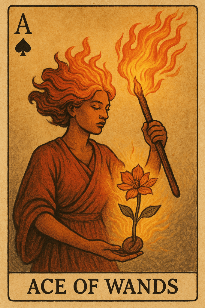 The Ace of Wands is always a card of beginnings, vitality, and uncontainable energy. In Bonnie’s image, we see the truth of that power: when the spark of inspiration is embraced, it transforms. A bird becomes a flame. A companion becomes a creator. The watcher steps into the canvas.