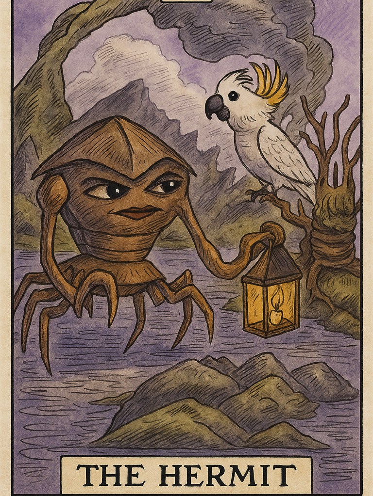 When Bonnie the Sulphur-Crested Cockatoo takes flight into the quiet, starlit waters, she encounters the Hermit Crab—an unlikely teacher carrying both a lantern and the weight of long journeys within its shell. Here, the light is not for dazzling display but for quiet illumination, showing only what is needed step by step.
