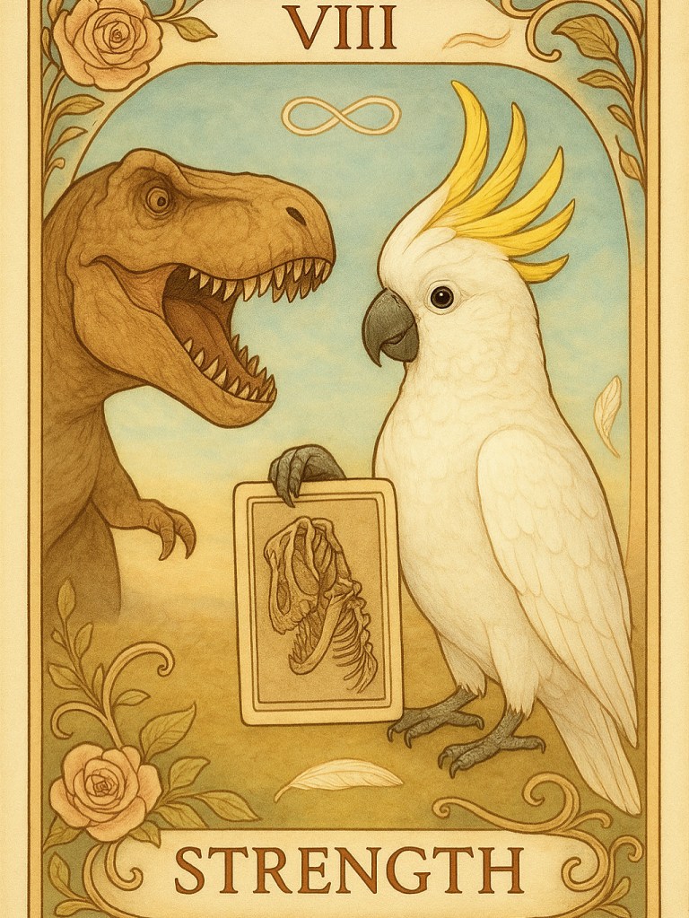 Strength here is not about overpowering the dinosaur but about meeting it with balance. Bonnie shows us that true strength lies in the quiet, steady presence that calms storms and tames fears. Her feathers may bristle, but she does not lash out. She holds the card of bones before her, a reminder that even the most fearsome creature is part of the same great cycle of life and death.