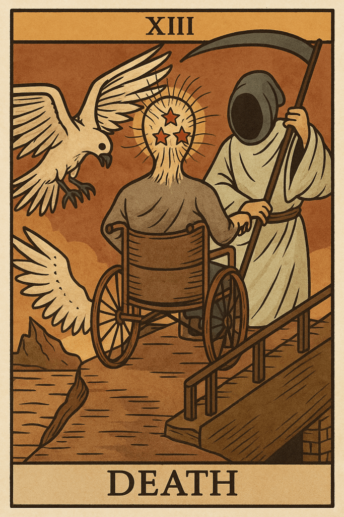 The Death card arrives not as a terror, but as a truth: a reminder that endings are woven into the very pattern of existence. In this depiction, the cloaked Reaper gently accompanies a figure in a wheelchair along the final path. Bonnie, the sulphur-crested cockatoo, flies beside them bearing witness.