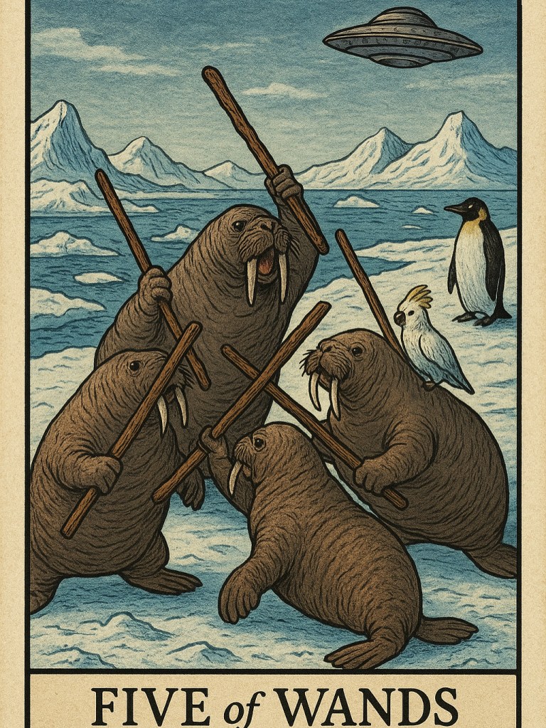 The Five of Wands represents tension, competition, and the push-and-pull of differing energies. Just as the walruses jostle for territory, we too find ourselves clashing with others—or even with ourselves—when our visions, ambitions, or egos collide. This card does not signal destruction but rather the necessary friction that sparks growth and innovation. From the struggle emerges clarity: Who will stand firm? Who will adapt?