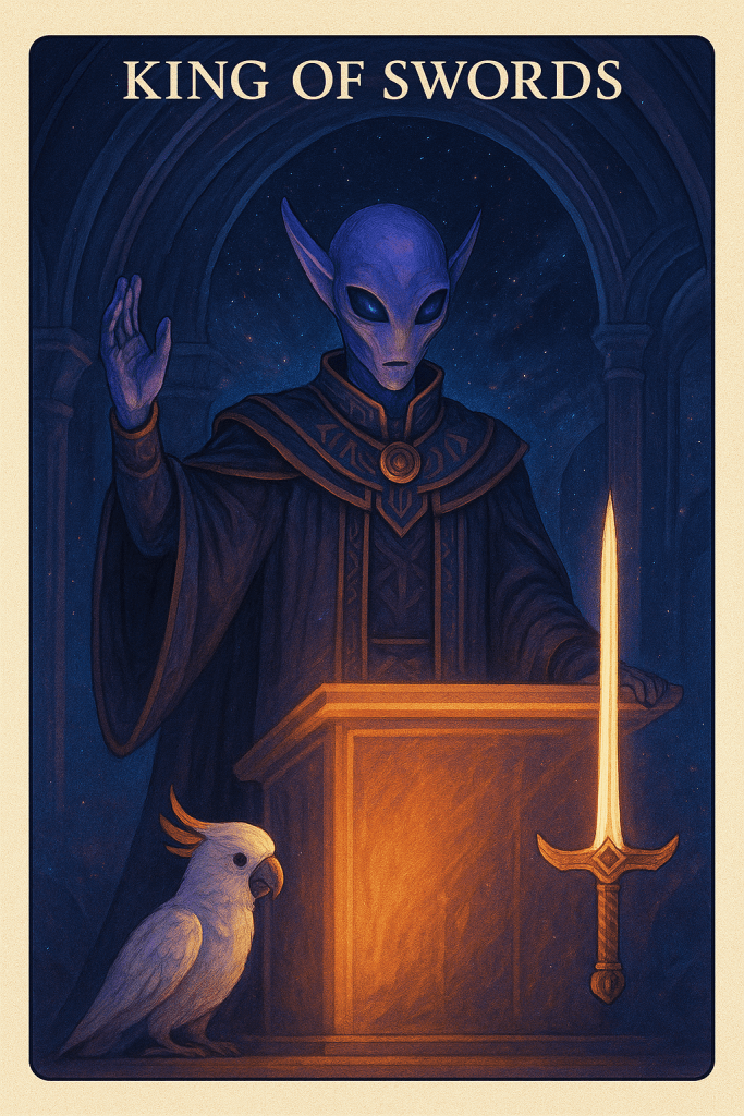 The King of Swords represents authority guided by intellect and integrity. He commands respect not through fear, but through the force of truth and the resonance of language. His judgments are fair, his vision is broad, and his speech cuts through illusion.
