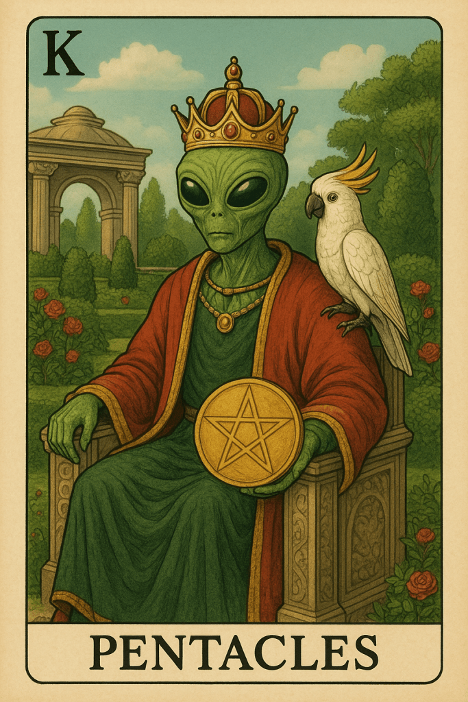 In the gardens of the Alien King, abundance hums through every living thing. The air itself glows with quiet prosperity — not of coin or trade, but of care, stability, and the continual tending of what truly matters. Bonnie the Cockatoo perches beside the King, a bright reminder that joy and companionship are also forms of wealth.