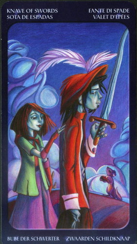 Clearly Christina Benintende wasn’t having any of this. Her Knave (Page) is anything but alert. To be frank, he reminds me of decidedly disinterested, pubescent, pimple ridden boys I taught when I was teaching in Secondary Colleges. Come to think of it, I wish I’d had a copy of this deck when I was trying to teach them to write creatively. The same lads would have been very receptive to this vibe and would have been certain to know a girl just like the one prodding this guy, encouraging him to take the sword to someone.