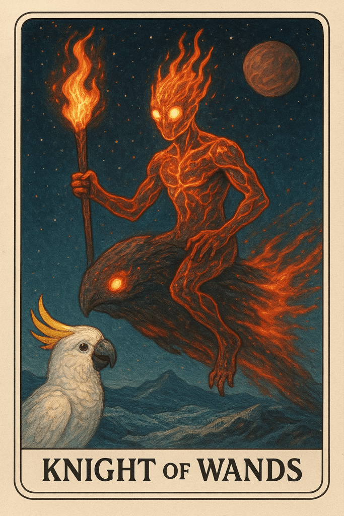 When Bonnie the Sulphur-Crested Cockatoo encounters the Knight of Wands, she is dazzled by a being of fire and momentum. This alien knight is forged from molten light, veins of energy glowing like rivers of lava, their spirit as untamed as the comet-beast they ride. They are a wanderer of galaxies, never still, always seeking new horizons.