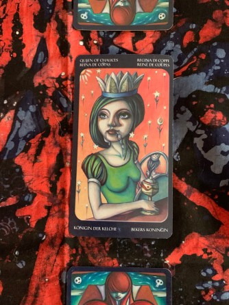 This is an intuitive person, someone who feels everything. Empathetic, they can ‘tune in’ to the people they meet and understand them on a deep level. This can make some folks feel uneasy around the Queen of Cups, whilst others may feel a sense of ease. This is someone who can truly see people for who they are”. source: Little Red Tarot
