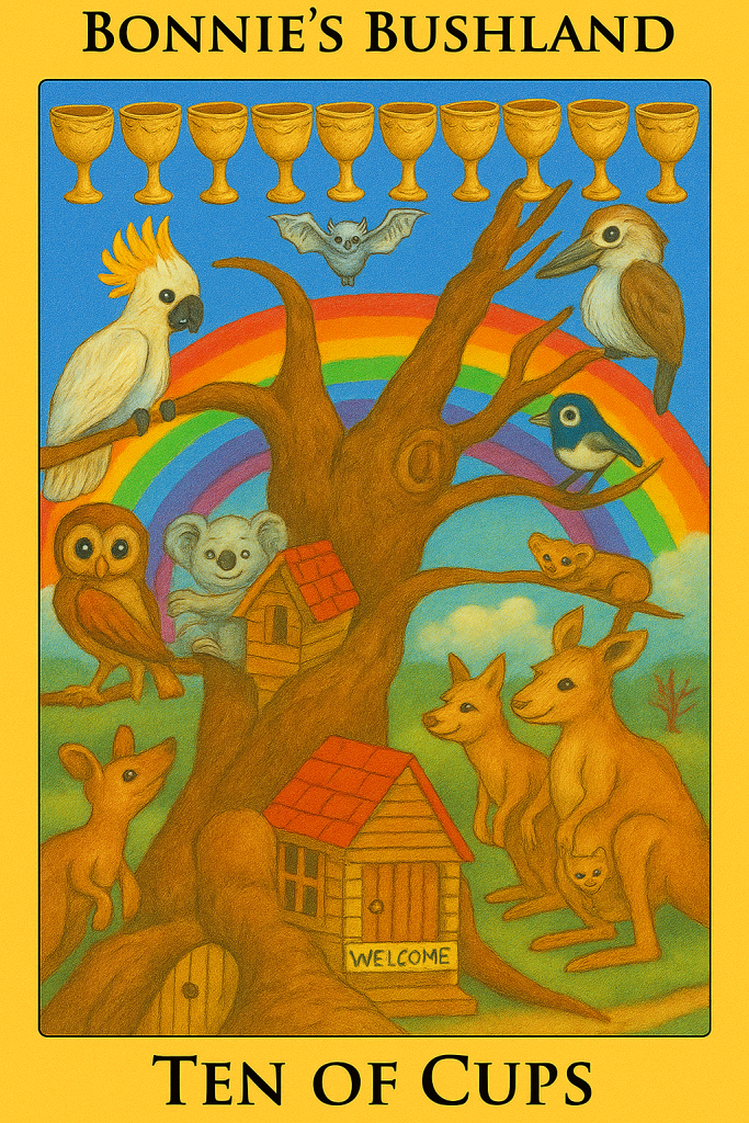 Bonnie rests high in her gum tree, surrounded by her kin of feather, fur, and wing. The kookaburra laughs, the owl listens, the kangaroo watches over her joey, and even the tiny bat joins in the dance of dusk. A rainbow arcs overhead — a blessing from the Dreaming — and ten golden cups shimmer in its light.
