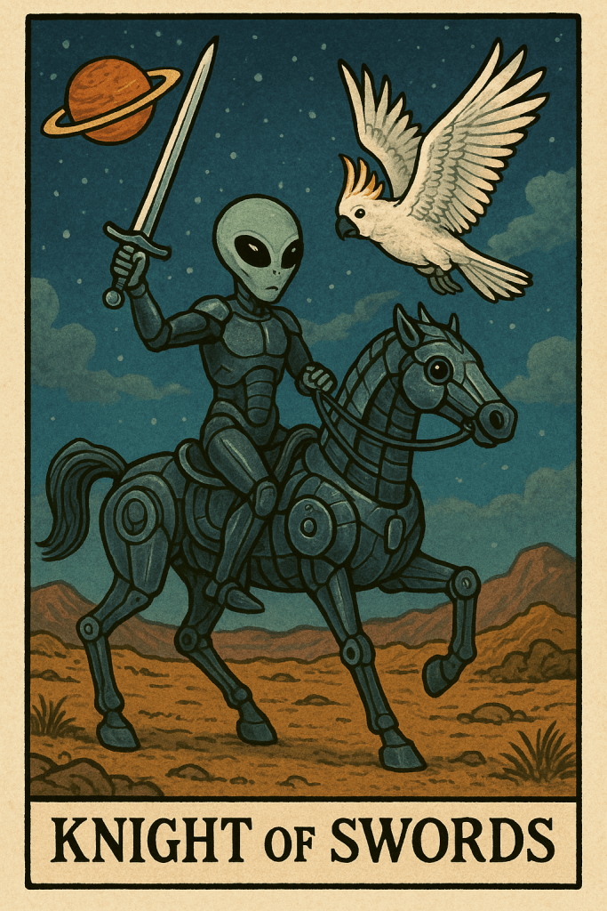 Words can liberate, but they can also wound. Like a sword, they require skill, courage, and responsibility. The Knight of Swords does not linger in doubt—he rides the robotic steed of intellect, propelled by swift thought, quick wit, and the unshakable belief that words can change worlds.