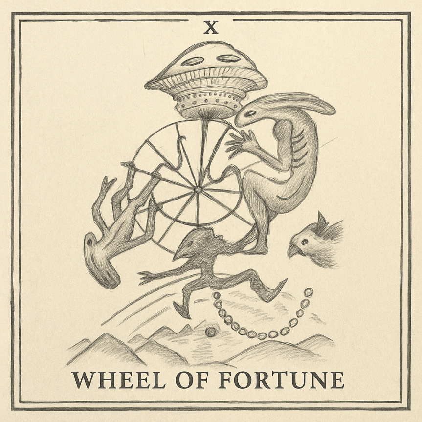 When Bonnie the Sulphur-Crested Cockatoo encounters the Great Wheel, she sees not only its constant turning but also the strange beings who live upon it: the long-limbed alien lizard clinging upside down, the distinctive rabbit-being curled in rest, the fox-creature sprinting with the spin, and the silent mushroom-vessel watching over all.