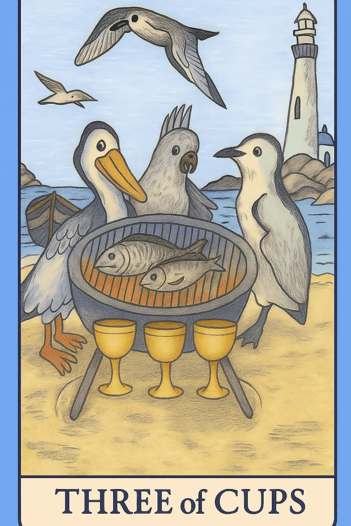 This card bubbles with friendship, connection, and celebration. It’s about gathering your flock, clinking cups, and enjoying life’s small, perfect moments. Whether it’s a shared meal, a cheeky joke, or a wave of mutual understanding, the Three of Cups reminds you that joy multiplies when it’s shared.